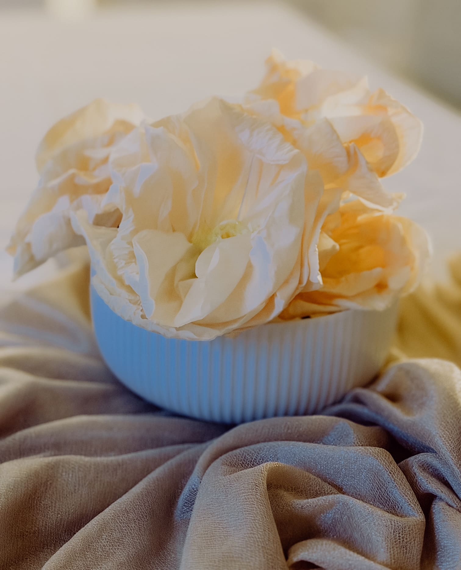 Moderne, skandinavische Blumenschale mit gerillter Optik in Creme. Durchmesser ca. 15 cm.
