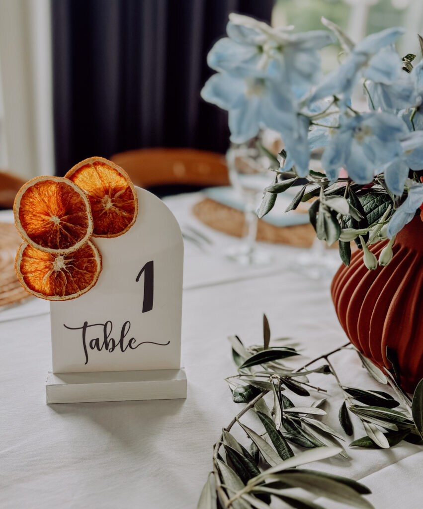 Ein absolutes Highlight der Dekoration in dem Restaurant waren die liebevoll gestalteten DIY-Ideen der Braut. Dadurch hat das Brautpaar der Dekoration eine individuelle Note verliehen. Mit dabei waren selbstgemachte weiße Tischnummern mit Orangenscheiben oder toll gestaltete Menükarten.
