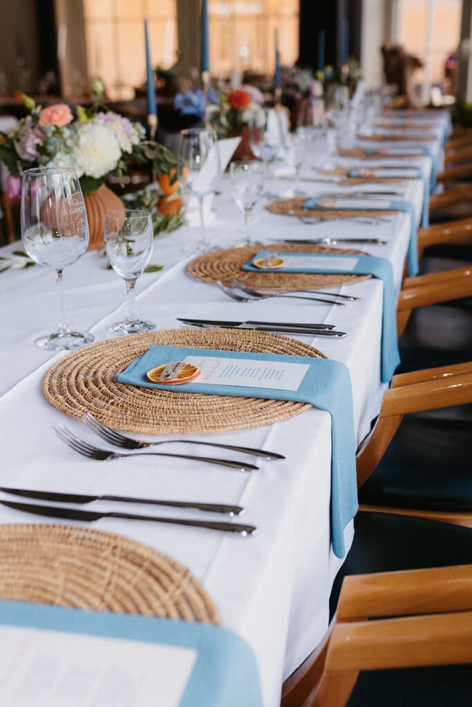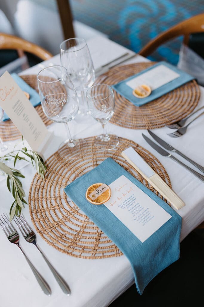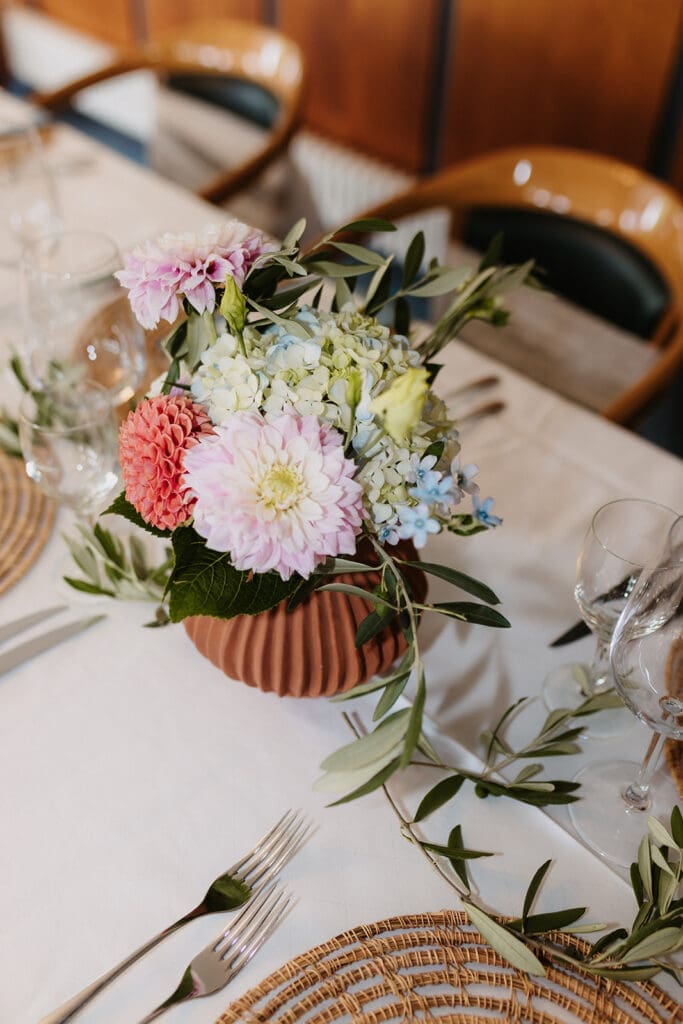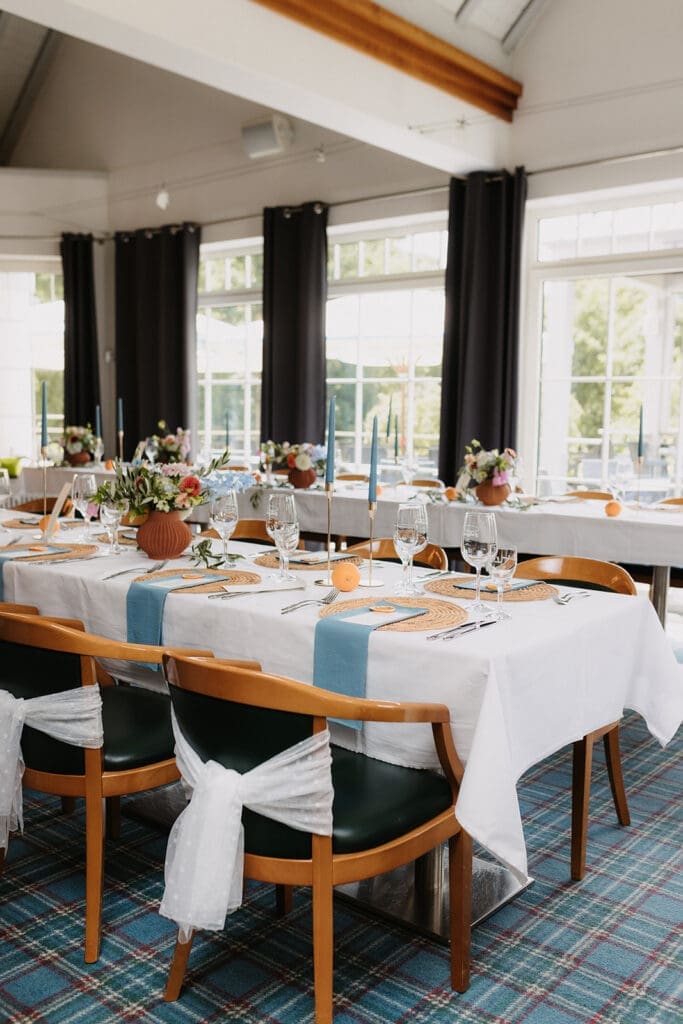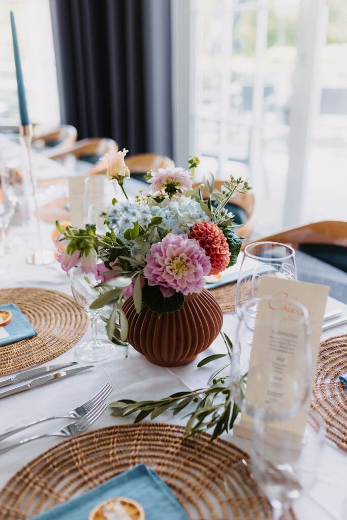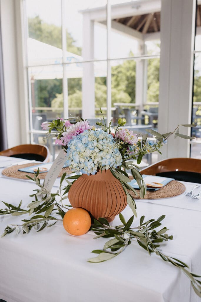 Große Terrakotta-Vasen, natürliche Materialien und warme Akzente in Orange harmonieren wunderschön mit den Stuhllehnen der Location. Die dustyblue farbigen Stabskerzen und Servietten greifen die Farbe des Teppichbodens und der Gardinen auf. Sie schaffen einen eleganten Kontrast: frisch, sommerlich und leicht.
