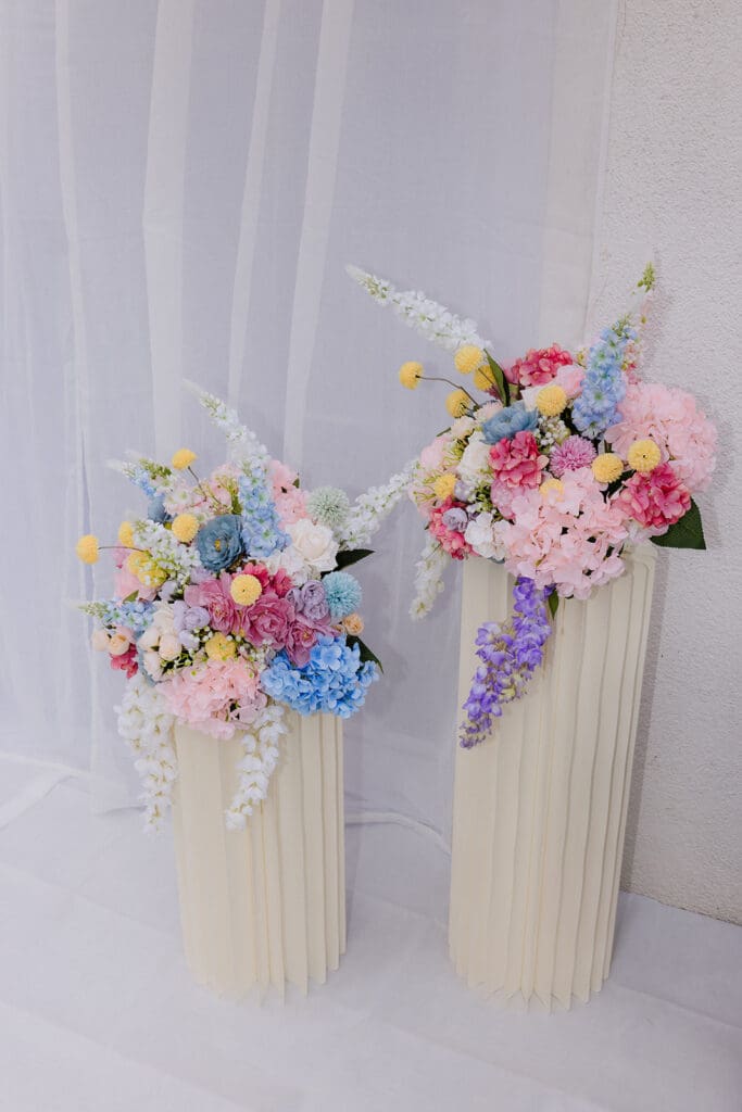 Die farbenfrohen, traumhaften Blumenarrangements von der lieben Nina (hazelandhill) bringen Lebendigkeit auf die Tische, während goldene Kerzenständer das Komplettpaket edel abrunden.